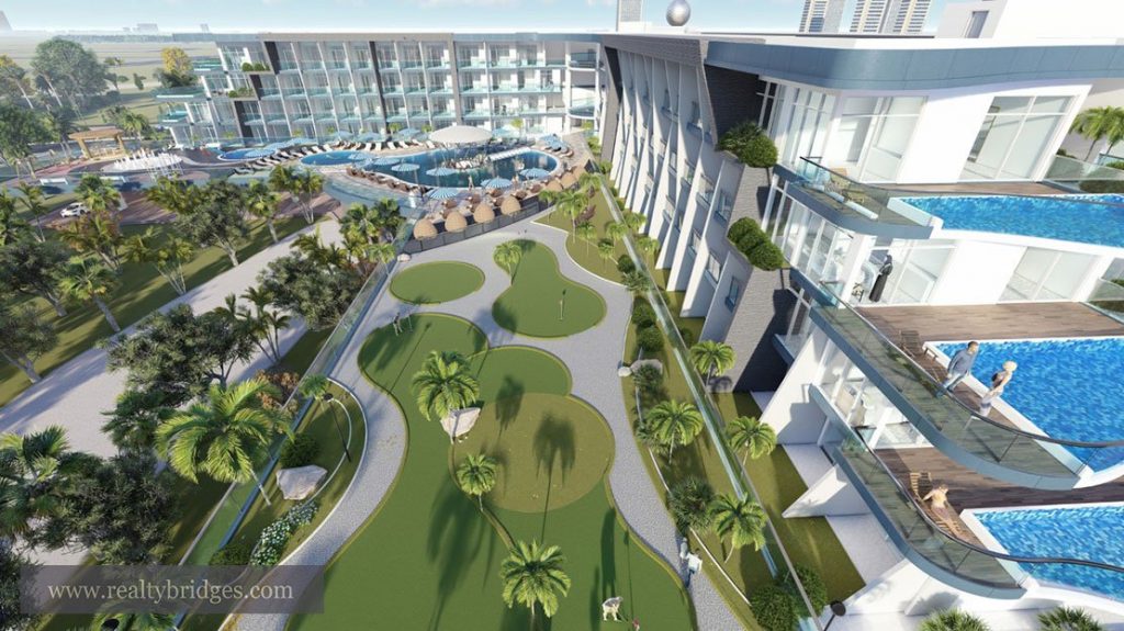 Designed according to the resort style, it includes a small golf course, indoor and outdoor sports halls, a large swimming pool with a private area for drinks and refreshments, a jacuzzi, a children’s play area and a pool with lots of green spaces and innovative water designs, to create a healthy lifestyle.